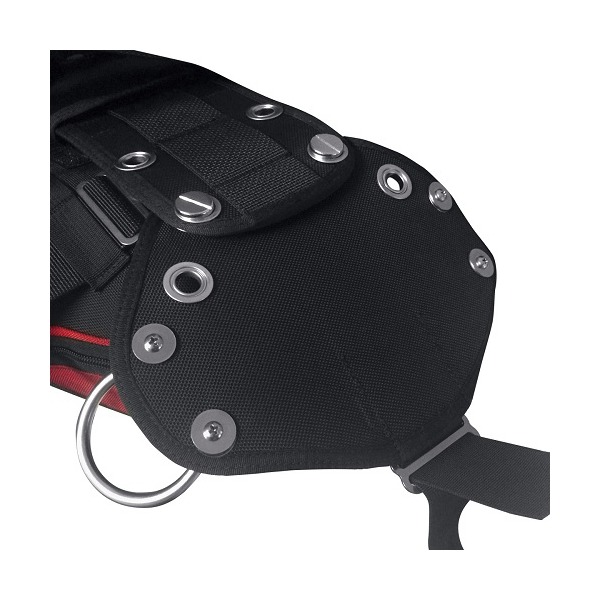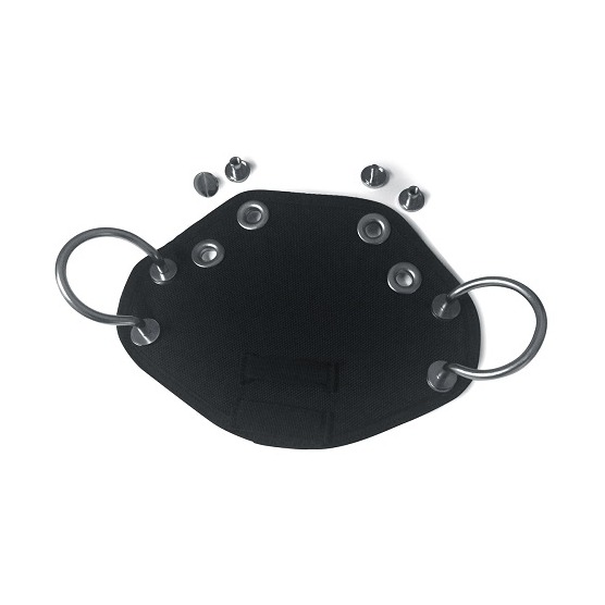 The Hollis Butt Plate allows divers who wish to transform their existing harness and buoyancy compensating wing into a rig capable of side-mounting tanks. Locked-tight into place using stainless steel assembly screws through slots on the back-plate. When side-mounting stage tanks or re-breather bailout bottles, butt-plate rails can be difficult to access if back-mounted gear covers them-up. Problem solved with Hollis Butt Plate. Its rectangular shape places tank attachment points at the edge of the diver's body, while outrigger hardware is easy to find due to its orientation facing outwards on the plate.